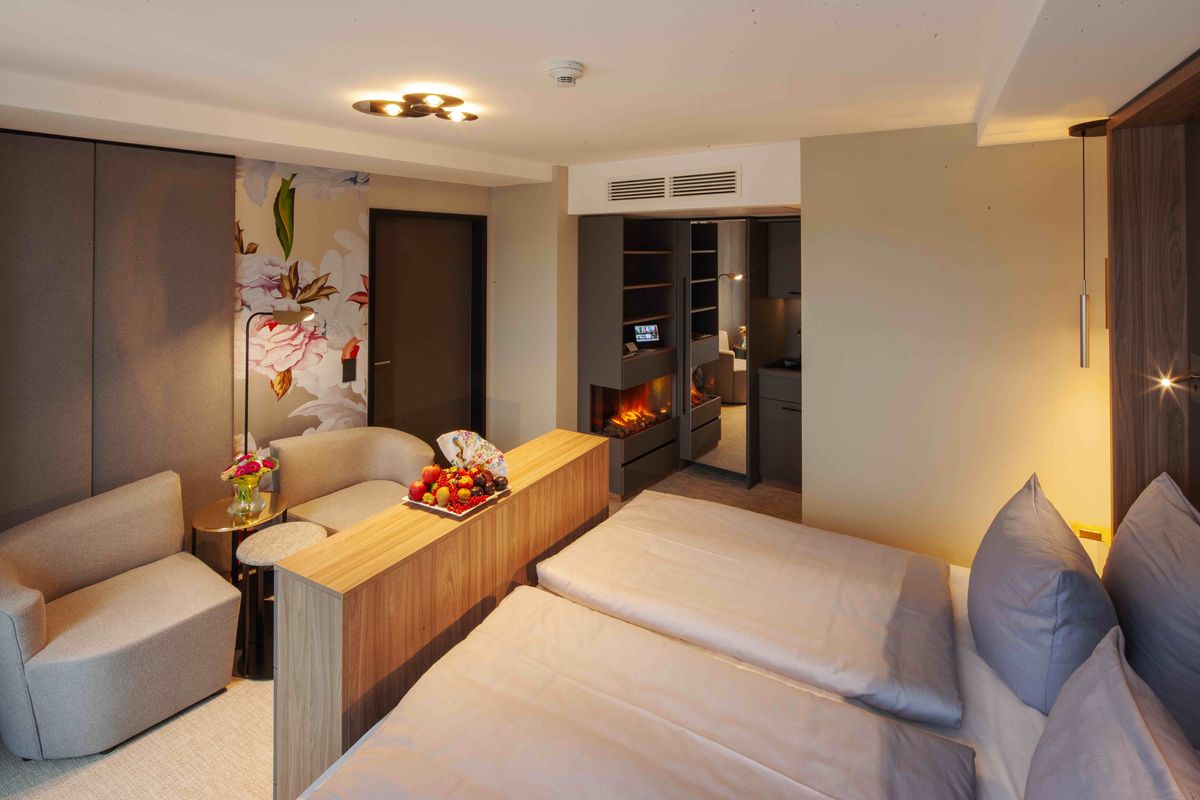 Ausstattung: Kaffee-/Tee-Station mit Wasserkocher und Kapsel-Kaffeemaschine, Kamin, Flat-TV, Minibar, Zimmersafe, Schreibhilfe, Boxspringdoppelbett mit Leselampen, kostenfreies WLAN, Bad mit Dusche /WC, Haarfön, Kosmetikspiegel, Babybett möglich teilweise in unterschiedlichen Zimmervarianten: Pantry-Küche, Klimaanlage, BD im BadBitte beachten Sie, dass aufgrund der Individualität unseres Hauses nur Zimmerbeispiele dargestellt sind. Sie haben die Möglichkeit, eine Zimmerkategorie zu buchen, jedoch keine Zimmervariante oder Zimmernummer. Details in der Ausstattung können abweichen. Ihre Wünsche versuchen wir selbstverständlich bei Verfügbarkeit zu erfüllen.