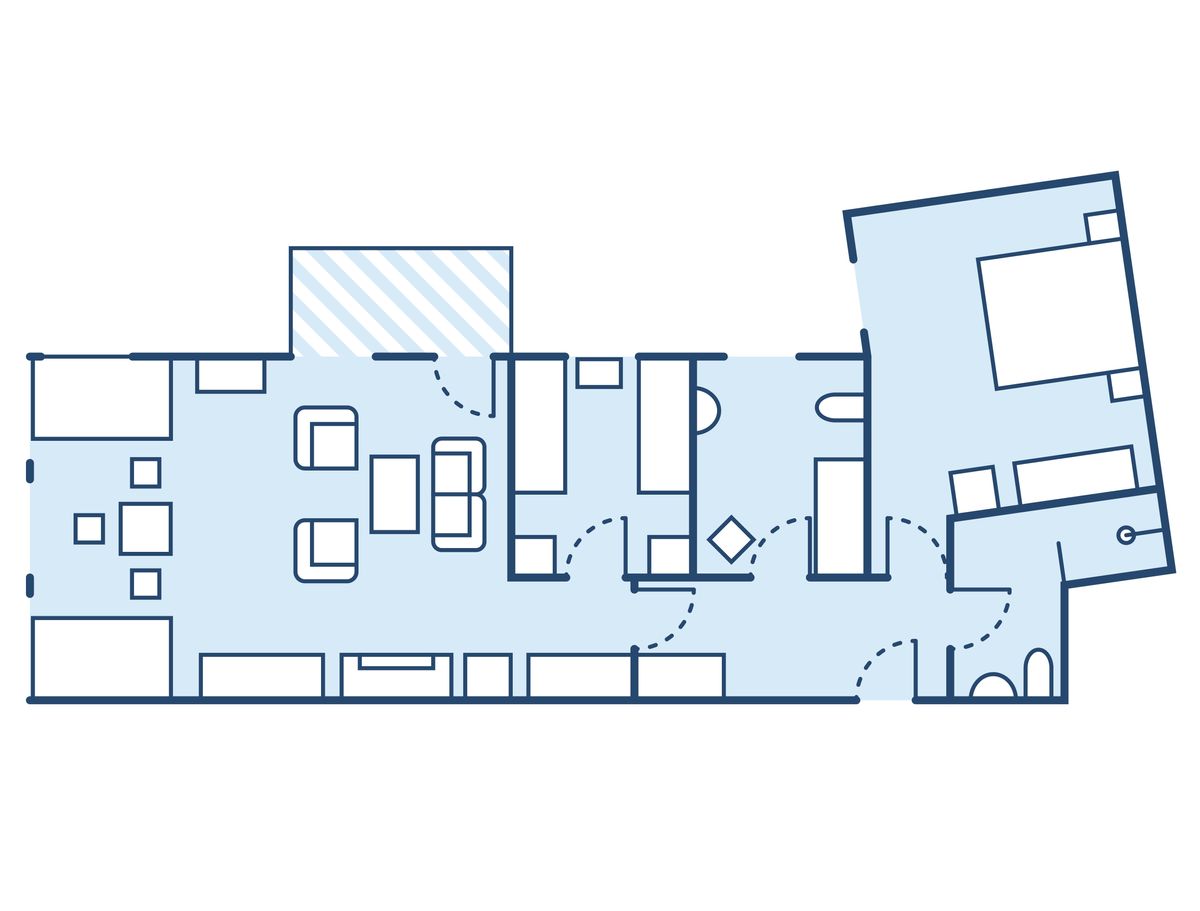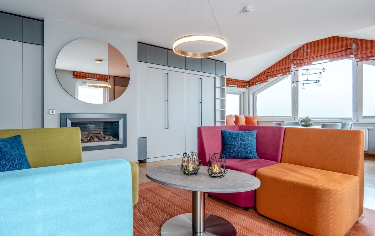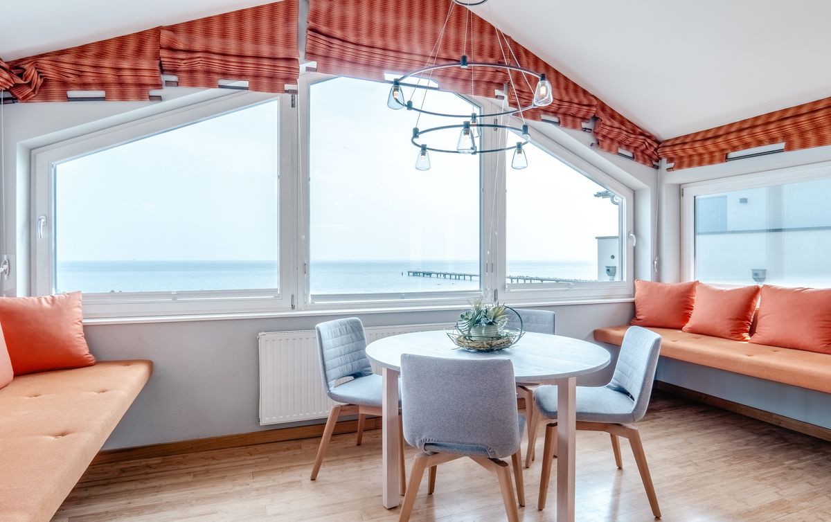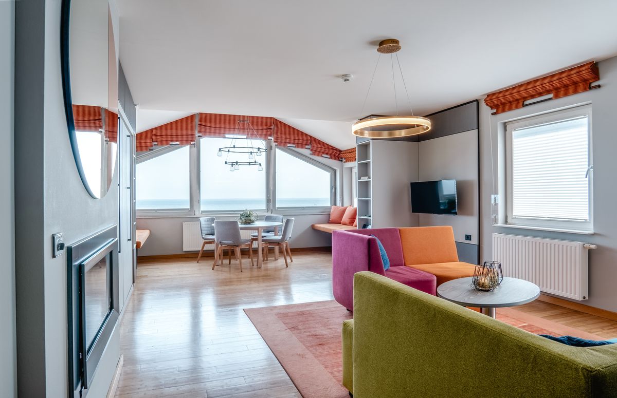 Ausstattung: Panoramafenster mit Ostseeblick, Pantry-Küche mit Cerankochfeld, Mikrowelle, Geschirrspüler, Spüle und Geschirr, Kaffee- und Teestation mit Wasserkocher und Kapsel-Kaffeemaschine Gas-Kamin, Flat-TV, Boxspringdoppelbett mit Leselampen, zwei Schrankbetten, Minibar, Zimmersafe, kostenfreies WLAN, ein Tageslicht-Bad mit Badewanne/WC und ein Bad mit Dusche ebenerdig/ WC, Haarfön, Kosmetikspiegel, Babybett möglichBitte beachten Sie, dass aufgrund der Individualität unseres Hauses nur Zimmerbeispiele dargestellt sind. Sie haben die Möglichkeit, eine Zimmerkategorie zu buchen, jedoch keine Zimmervariante oder Zimmernummer. Details in der Ausstattung können abweichen. Ihre Wünsche versuchen wir selbstverständlich bei Verfügbarkeit zu erfüllen.