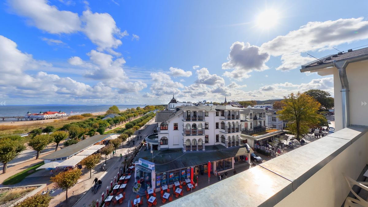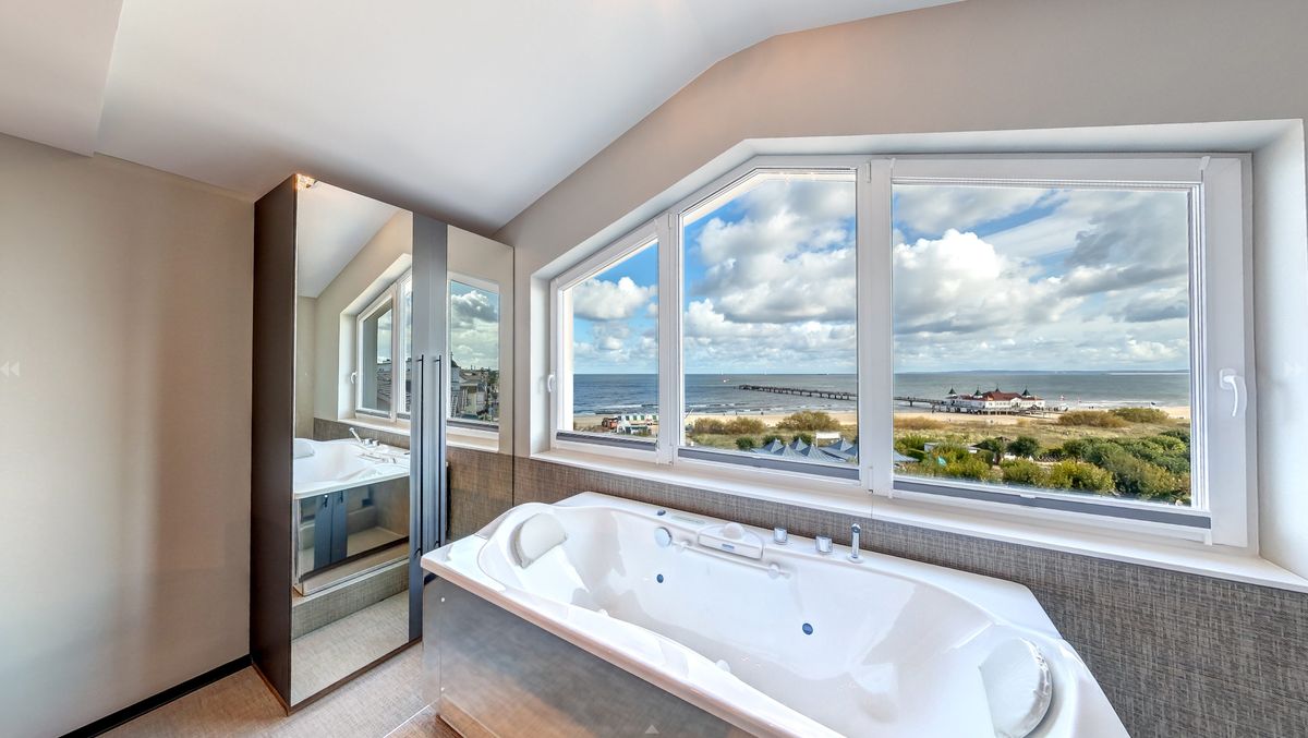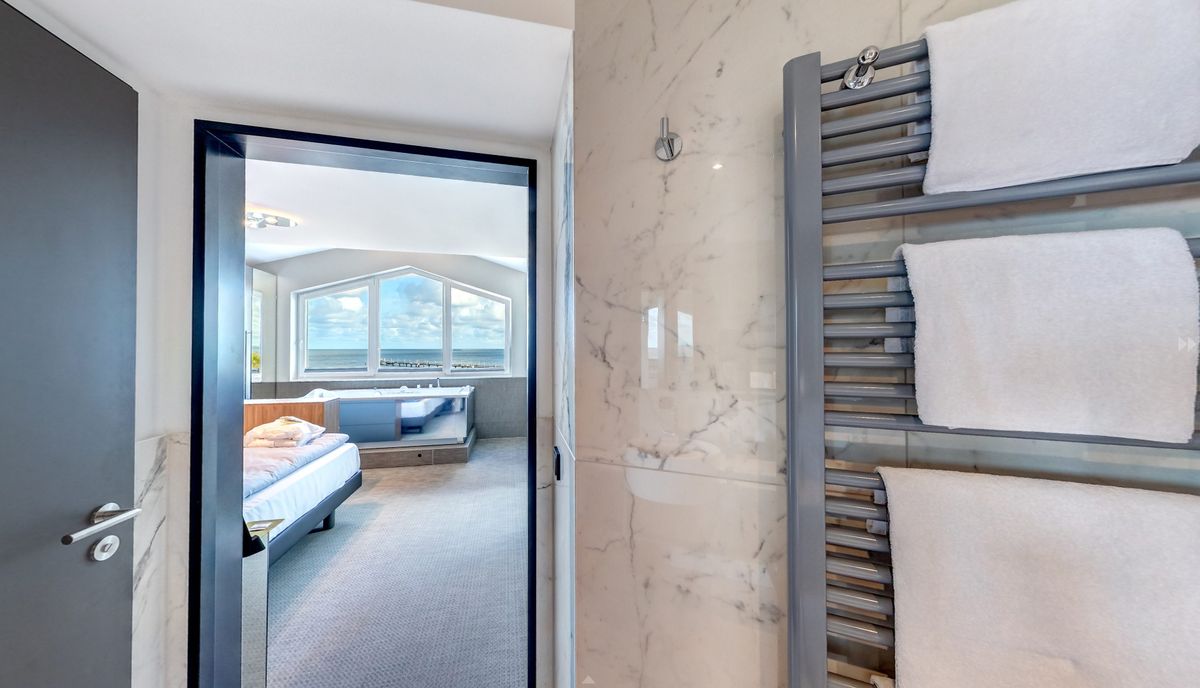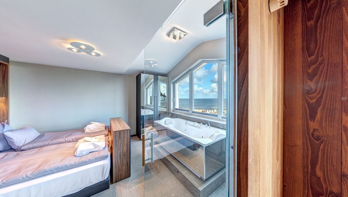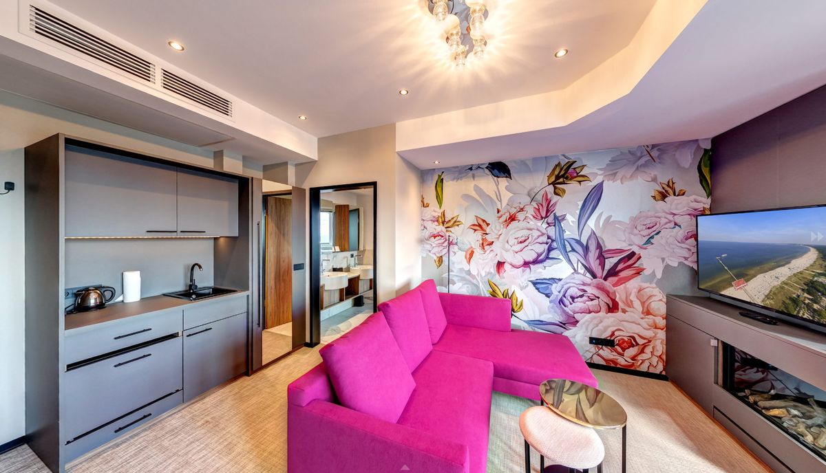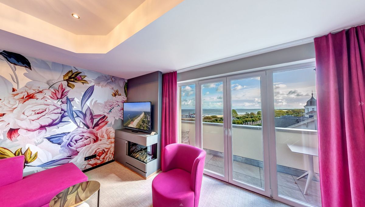 Ausstattung: Balkon mit Ostseeblick, Panoramafenster, Klimaanlage, 3D-Kamin mit einstellbarer Wärmeleistung, Flat-TV, Boxspringdoppelbett mit Leselampen, zwei Schrankbetten, Kleiderschrank, Pantry-Küche mit Minibar, Kaffee- und Teestation mit Wasserkocher und Kapsel-Kaffeemaschine, mobilem Induktionskochfeld, Mikrowelle, Spüle und Geschirr, Zimmersafe, kostenfreies WLAN, Schreibgelegenheit, Sauna, Lichtwanne in den Schlafzimmern, Bad mit Regendusche, Waschtisch, WC und Bidet, separates WC mit Bidet, Fön, Kosmetikspiegel, zusätzliche Dusche im Schlafzimmer , Gardinen: lichtdurchlässig oder verdunkelnd, Babybett möglichBitte beachten Sie, dass aufgrund der Individualität unseres Hauses nur Zimmerbeispiele dargestellt sind. Sie haben die Möglichkeit, eine Zimmerkategorie zu buchen, jedoch keine Zimmervariante oder Zimmernummer. Details in der Ausstattung können abweichen. Ihre Wünsche versuchen wir selbstverständlich bei Verfügbarkeit zu erfüllen.