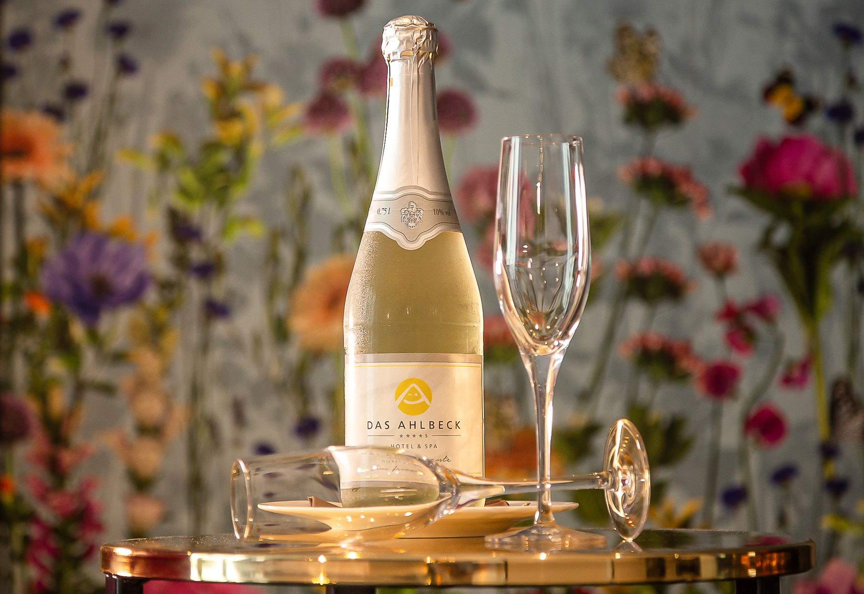 Eine Flasche Perlwein auf dem Anreisezimmer